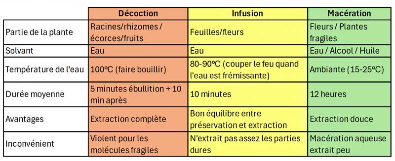 Comparaison des différentes méthodes (infusion, macération, décoction), de leurs paramètres et de leurs avantages/inconvénients.