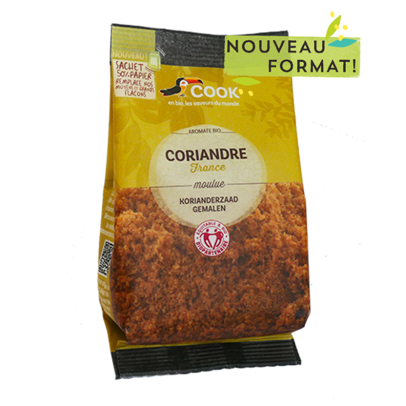 La coriandre est une plante herbacée annuelle pouvant atteindre près d’un mètre de haut. Elle produit des feuilles (que l’on consomme également) vertes glabres au bout de tiges élancées. Ses fleurs sont blanches et produisent des fruits contenant deux graines. Ses racines sont également comestibles et utilisées dans la cuisine thaïlandaise. La coriandre est cultivée sur des zones tempérées à travers le monde entier.Notre filière plantes de garrigues se situe dans le Sud de France. C’est un partenariat depuis 2010, labellisé Biopartenaire (commerce équitable) depuis 2017. C’est une filière dont nous sommes particulièrement fières car nous avons fortement contribué à la monter, et ce afin de relocaliser un savoir-faire.