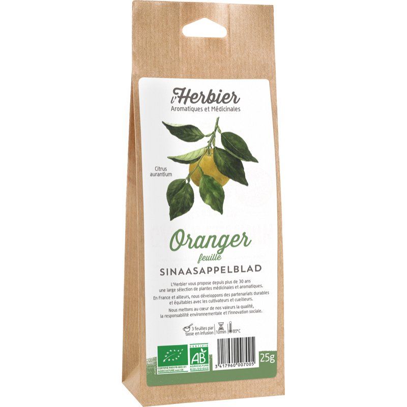 Composition : feuilles d'Oranger amer* (Citrus aurantium) * : produit issu de l’agriculture biologique certifiée par FR-BIO-01.