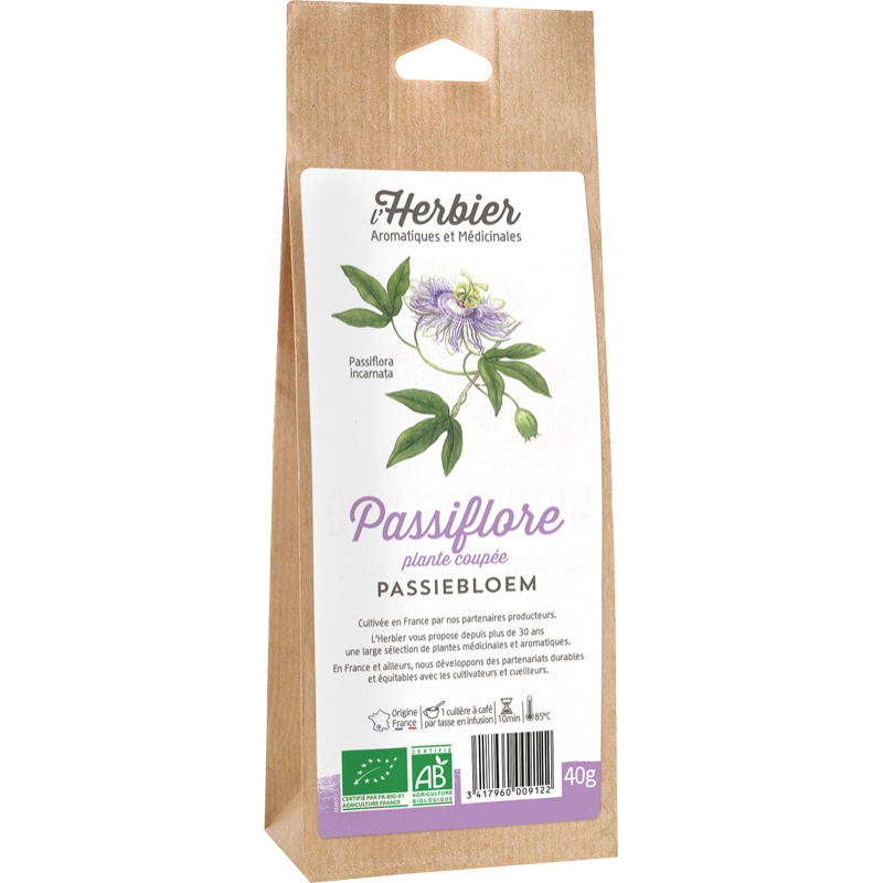 Composition : Passiflore* (Passiflora incarnata), plante entière coupée.