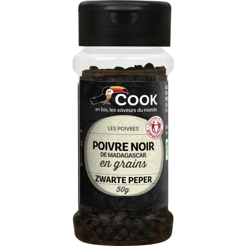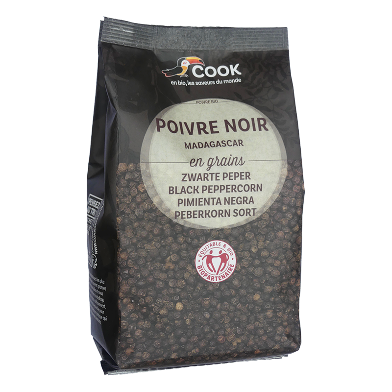 Le poivrier noir est une liane vivace à tiges ligneuses glabres de plusieurs mètres de long. Il porte des feuilles alternes mais groupées par 2 ; le limbe vert est de forme ovale un peu cordée, la face supérieure assez luisante. Au niveau de l’insertion des feuilles sur la tige, partent des inflorescences blanches en épis. Les fruits sont des baies à une seule graine (on parle de drupe) de 3 à 4 mm de diamètre, d’abord vertes, passant au rouge à maturité. Le poivrier noir s’épanouit sous un climat tropical et supporte très mal les températures inférieures à 15°C. Il a besoin d’une quantité d’eau importante (2000 à 3000 mm) ainsi que d’une période moins humide pour la maturation des baies. Il affectionne des sols bien drainés. Pour obtenir du poivre noir, on cueille la baie lorsqu’elle est jaune-marron et on la fait sécher au soleil.La région du Sambirano à Madagascar fournit notre poivre noir. C’est un partenariat datant de 2012, labellisé commerce équitable (Biopartenaire) depuis 2017. Le contrat garantit des prix rémunérateur sur 3ans minimum. 5% du montant total des achats est également reversé dans des fonds de développement gérés par les producteurs.
