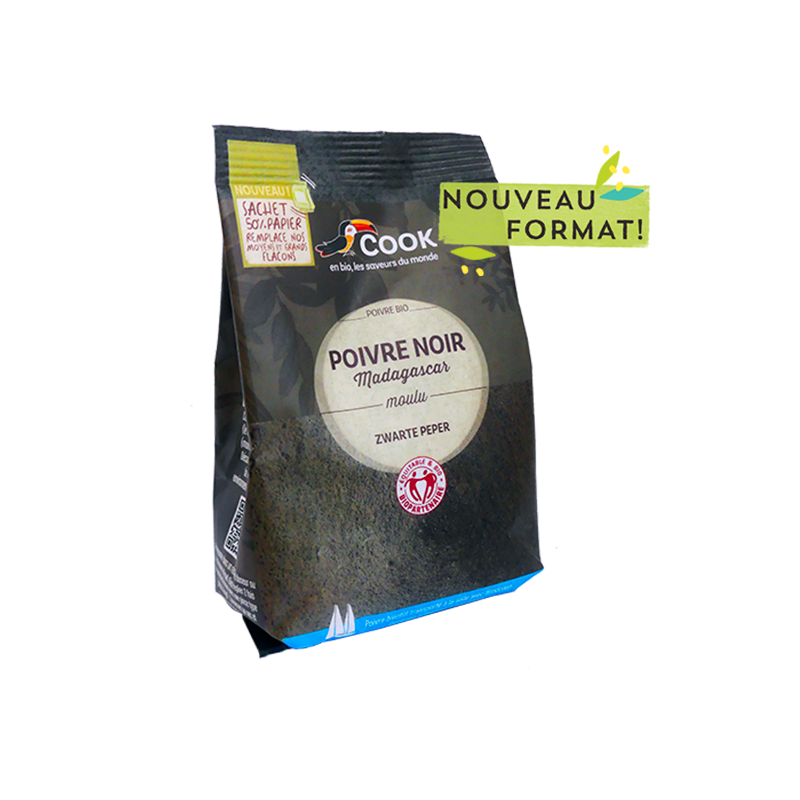Le poivrier noir est une liane vivace à tiges ligneuses glabres de plusieurs mètres de long. Il porte des feuilles alternes mais groupées par 2 ; le limbe vert est de forme ovale un peu cordée, la face supérieure assez luisante. Au niveau de l’insertion des feuilles sur la tige, partent des inflorescences blanches en épis. Les fruits sont des baies à une seule graine (on parle de drupe) de 3 à 4 mm de diamètre, d’abord vertes, passant au rouge à maturité. Le poivrier noir s’épanouit sous un climat tropical et supporte très mal les températures inférieures à 15°C. Il a besoin d’une quantité d’eau importante (2000 à 3000 mm) ainsi que d’une période moins humide pour la maturation des baies. Il affectionne des sols bien drainés. Pour obtenir du poivre noir, on cueille la baie lorsqu’elle est jaune-marron et on la fait sécher au soleil.La région du Sambirano à Madagascar fournit notre poivre noir. C’est un partenariat datant de 2012, labellisé commerce équitable (Biopartenaire) depuis 2017. Le contrat garantit des prix rémunérateur sur 3ans minimum. 5% du montant total des achats est également reversé dans des fonds de développement gérés par les producteurs.
