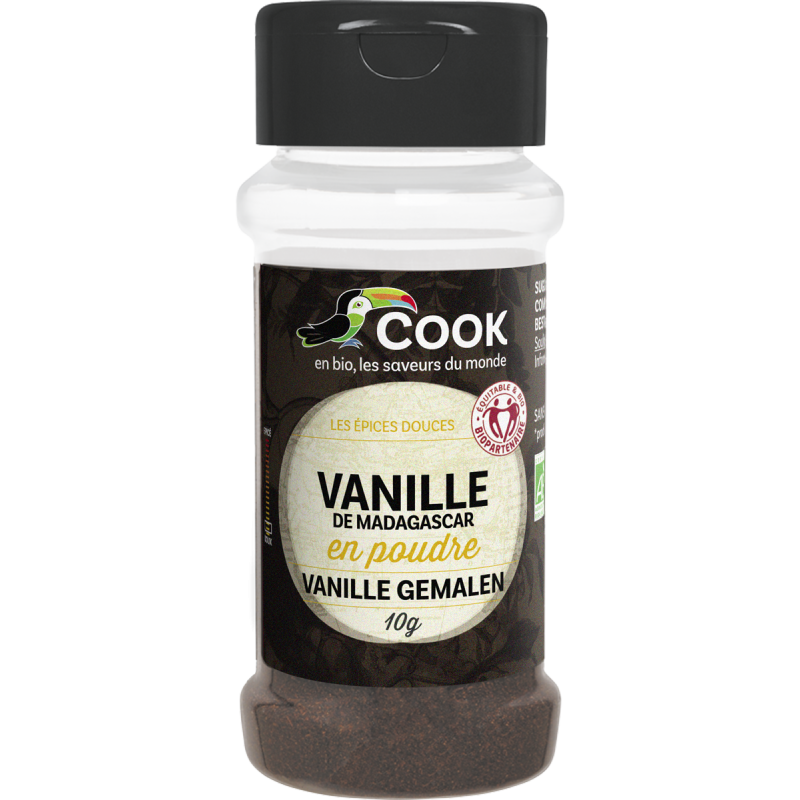 Le vanillier est une liane qui peut atteindre jusqu’à 10m de haut. Ses feuilles sont longues, planes et ovales à bouts pointus. Ses fleurs sont blanches, se rapprochant d’une orchidée. Les fruits du vanillier, qui donnent les gousses, sont issus – dans ses zones d’origine – de la fécondation de l’ovaire de la fleur par des espèces d’abeilles particulières. Aujourd’hui, la vanille est cultivée par bouturage et la fécondation est faite à la main, pédoncule par pédoncule. La vanille pousse en zone humide tropicale, près de supports ombragés qui lui permettent de croître.La région du Sambirano à Madagascar fournit notre vanille et notre poivre noir. C’est un partenariat datant de 2012, labellisé commerce équitable (Biopartenaire) depuis 2017. Le contrat garantit des prix rémunérateur sur 3ans minimum. 5% du montant total des achats est également reversé dans des fonds de développement gérés par les producteurs.