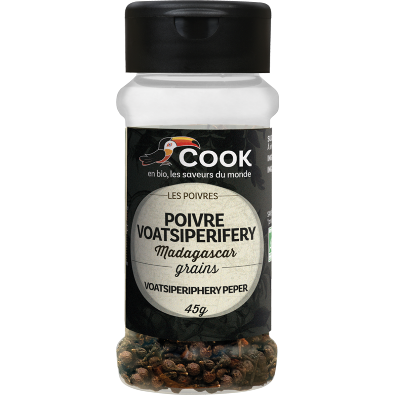 Le poivre noir Voatsiperifery est originaire de Madagascar. Il développe des saveurs piquantes et légèrement fruitées et mentholées.